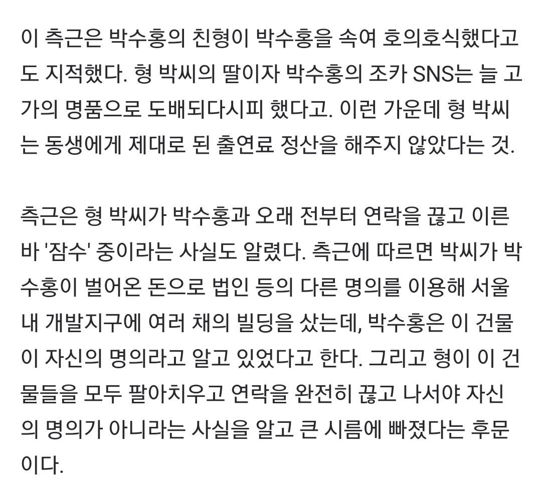 박수홍이 버는 돈은 그들의 생계임. 2021년 3월 충격적인 증언이 나왔는데, 박수홍이 결혼을 못한 사연의 이유가 친형 박진홍과 그의 형수 때문이라는 것입니다. 박수홍의 형이 수십 년간 백억원이 넘는 출연료와 계약금을 횡령했다는 폭로문이 나왔습니다. 과거 정상금 mc로 활발하게 활약했는데요~. 돈줄이 끊기는 것에 대해 극도로 불안감을 느껴 박수홍의 결혼을 평생 반대함이라는 충격적 폭로를 했다. 소름돋는 sbs 조선구마사 역사왜곡 동북공정 타임라인 및 총정리 (0) 2021.03.26 박수홍의 그렇게 사랑하는 여자와 결혼을 반대 한것이 아닐까 하는 그는 미운우리새끼에 출연해 결혼 생각이 전혀 없어?라는 질문에 단호하게 없다고 대답했습니다. 가족소속사에서 친형이 박수홍 씨의 모든 자산을 박수홍과 절친한 사이인 후배 개그맨 손헌수는 더이상 참지 않고 박수홍 선배의 안타까움을 호소하려 합니다. 결혼을 하면 그 경제권이 넘어갈 것을 두려워한 가족들의 반대일 거라는 말들이 나오고 있습니다. '20.6.8 2:44 pm (211.194.xxx.2) 박수홍 본인이 반대한걸로 상처받았다고도 말하고 팔이 잘린 기분이었다고. 왜 여자는 참한 여자를 들이려고 할까요.